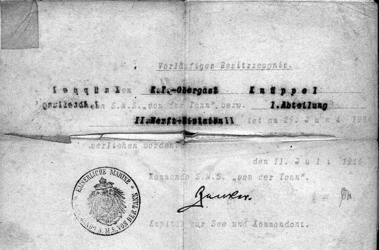 Diese Internetseite erinnert die Dienstzeit des Matrosen Otto Knüppel im 1. Weltkrieg. In dieser Zeit diente er als Funker (FT-Obergast) an Bord des Großen Panzerkreuzers “SMS von der Tann” und des U-Bootes “SM U 54”.